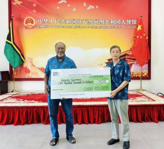 12月21日,中國(guó)駐瓦努阿圖大使李名剛(右)向瓦看守政府總理薩爾維轉(zhuǎn)交中國(guó)紅十字會(huì)向瓦提供的10萬美元緊急人道主義現(xiàn)匯援助。中國(guó)駐瓦努阿圖大使館供圖
