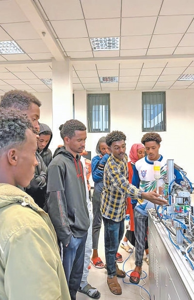 埃塞俄比亞魯班工坊當?shù)亟處煘閷W生們講解機電一體化設(shè)備的操作方法。