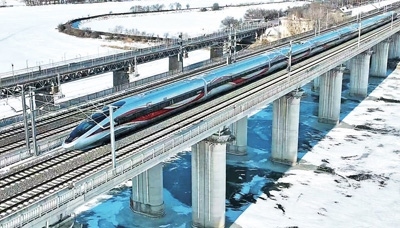 新型復興號高寒智能動車組行駛在哈齊高鐵松花江特大橋上。