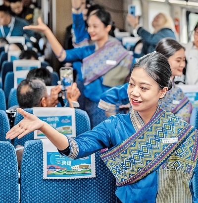 1月14日,中國鐵路昆明局集團有限公司“金花列車員”在D87次中老鐵路國際旅客列車上表演節(jié)目。