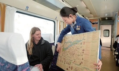 高鐵車廂內,乘務員向米婭(左)介紹哈爾濱旅行攻略。