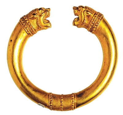 在古代伊朗文化中,環(huán)形因形似太陽,是密特拉信仰主神的象征,被賦予存在、原初、創(chuàng)世與永恒等含義。獨立展柜中陳列著一枚公元前2世紀的青銅授權環(huán)。授權環(huán)又稱“權力之環(huán)”,象征著權力的授予,授權時雙方各從一端握住它。展覽海報上的黃金獅首授權環(huán),為阿契美尼德王朝(公元前550年—公元前330年)的代表文物。