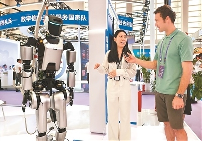 在浙江省寧波國際會展中心的第十四屆智博會現(xiàn)場,一位外國朋友采訪人形機(jī)器人展商。