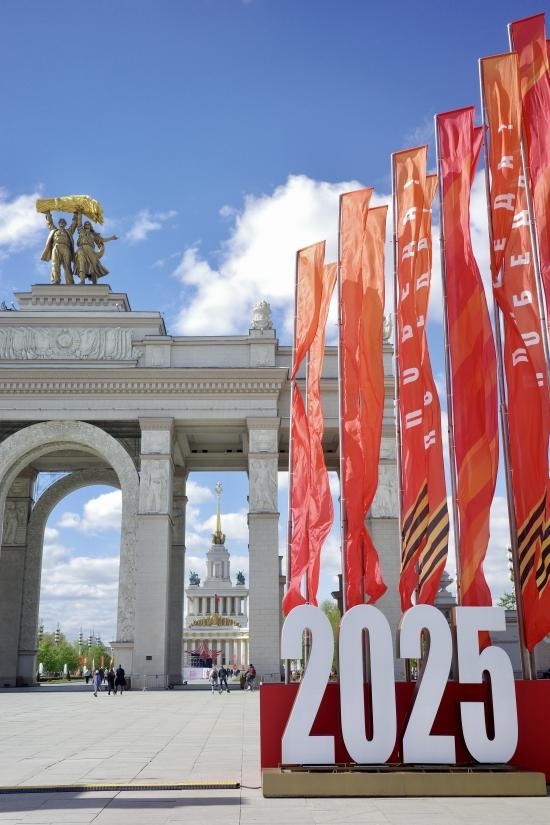 當(dāng)?shù)貢r(shí)間5月6日,莫斯科威登漢(國民經(jīng)濟(jì)成就展覽館)大門前一側(cè),布置好了2025標(biāo)志和紀(jì)念旗幟。劉少華 攝