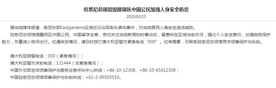第二條“提醒領區(qū)中國公民加強人身安全防范”。該提醒說,據當地媒體報道,悉尼東部Eastgardens區(qū)域近日出現(xiàn)街頭襲擊事件,對當地居民人身安全造成威脅。“駐悉尼總領館提醒領區(qū)中國公民、中國留學生等,密切關注當地新聞和時事動態(tài),留意所在區(qū)域治安狀況,強化個人安全意識,加強自我保護能力,盡量減少夜間出行。如遇突發(fā)情況,請及時撥打澳大利亞警方緊急電話‘000’。如有需要,可聯(lián)系駐悉尼總領館尋求領事保護與協(xié)助。”