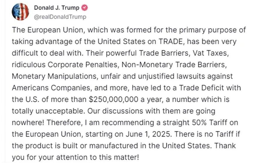 他說,美歐之間的磋商停滯不前。“因此,我建議自2025年6月1日起,對歐盟商品統(tǒng)一征收50%關稅。若產(chǎn)品在美國本土生產(chǎn)制造,則免征關稅?!?/p>