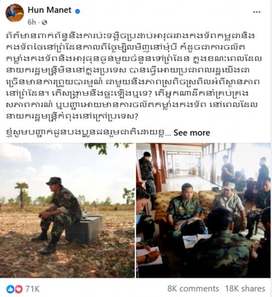 洪瑪奈在社交媒體上發(fā)文說,“我希望柬泰兩國陸軍高層今天的會談能夠取得積極成果,一如既往地保持雙方前線部隊間的和平與良好溝通”。