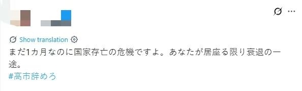 此外,高市在個人社交媒體上的相關(guān)言論同樣引發(fā)巨大爭議。她近期發(fā)布的帖文在日本網(wǎng)民中激起強(qiáng)烈反響,評論區(qū)滿是對其錯誤言論的不滿和譴責(zé),不少民眾要求其撤回涉臺不當(dāng)言論、向中國道歉,并辭去首相職務(wù)。