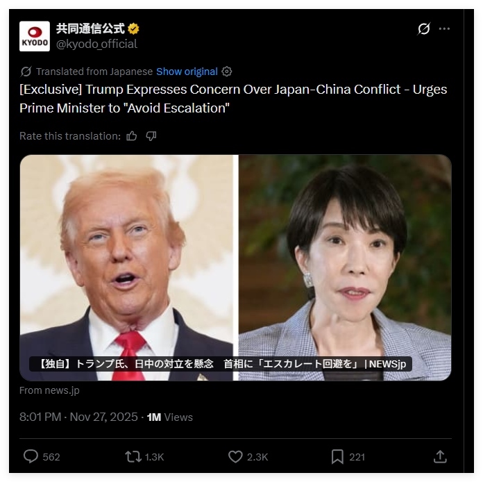 不過,盡管日本政府否認,包括路透社在內(nèi)的更多西方媒體,卻陸續(xù)通過其他信源印證了特朗普讓高市早苗不要刺激中國的情況。就連日本共同社也在報道中提及此事——當然,共同社同樣遭到了日本右翼分子的圍攻。