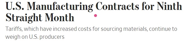 《華爾街日報》1日發(fā)表文章稱,美國供應(yīng)管理協(xié)會(ISM)當天公布的調(diào)查報告顯示,11月美國制造業(yè)采購經(jīng)理人指數(shù)(PMI)已低于50的榮枯分界線。美國制造業(yè)活動連續(xù)第九個月萎縮,而美國制造商認為這主要是因為美國政府的關(guān)稅政策。