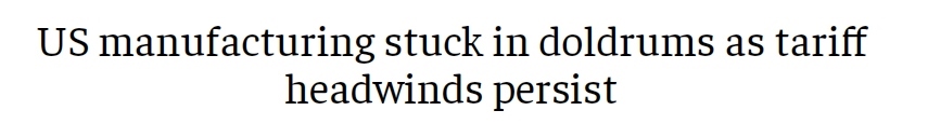 文章指出,美國政府曾辯稱,加征關(guān)稅是保護美國國內(nèi)制造業(yè)的必要之舉,但經(jīng)濟學(xué)家則認為,由于包括勞動力短缺在內(nèi)的結(jié)構(gòu)性問題,美國制造業(yè)已無法恢復(fù)昔日輝煌。文章援引高頻經(jīng)濟咨詢公司首席經(jīng)濟學(xué)家卡爾·溫伯格(Carl Weinberg)的話表示,“從(ISM)這份報告中,我沒有看到自關(guān)稅政策出臺以來,美國制造業(yè)出現(xiàn)任何增長的跡象,美國制造業(yè)已經(jīng)病了。”