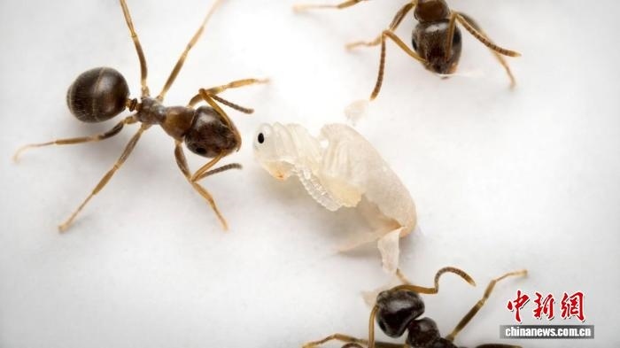 螞蟻檢查幼蟲(圖片來自Christopher D. Pull/奧地利科技學院)。施普林格·自然 供圖