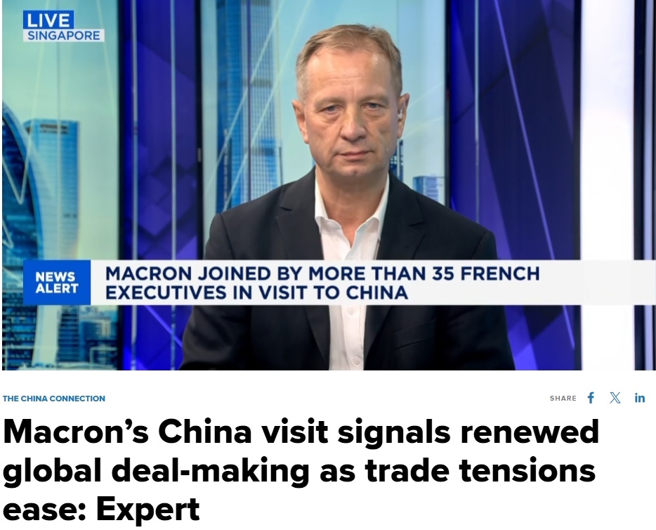 近日,法國總統(tǒng)馬克龍的訪華之行引發(fā)國際社會廣泛關(guān)注。美國消費者新聞與商業(yè)頻道(CNBC)采訪專家指出,這一中法重要外交活動標(biāo)志著全球貿(mào)易緊張局勢的緩和,意味著一度受阻的全球貿(mào)易談判重回正軌,為國際經(jīng)貿(mào)合作注入新的活力。