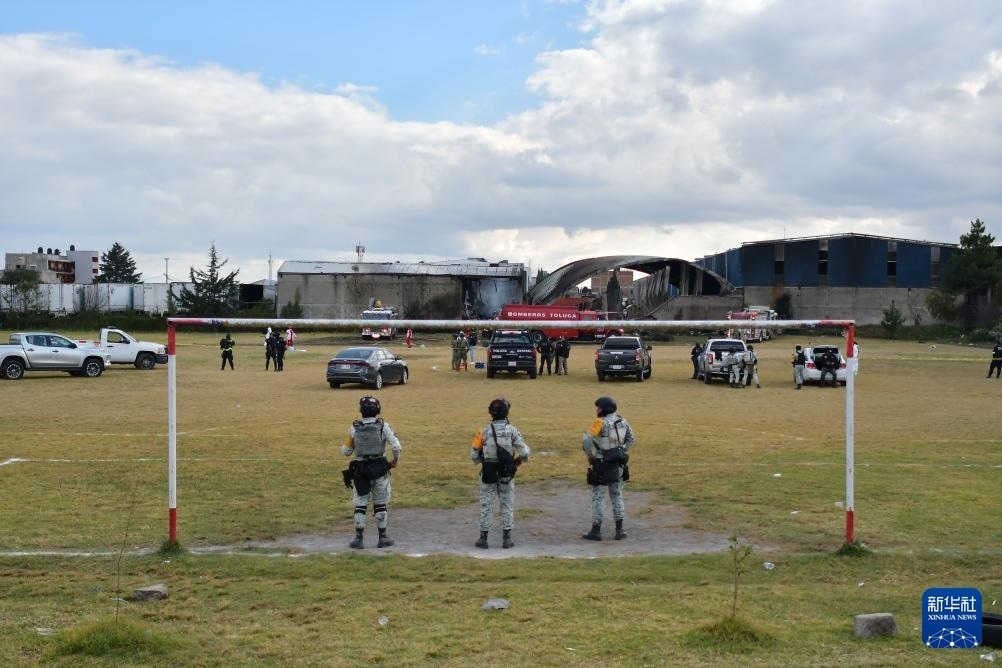 12月15日,在墨西哥中部墨西哥州托盧卡市,國民警衛(wèi)隊人員在事故現(xiàn)場警戒。新華社發(fā)(阿圖羅·埃爾南德斯攝)