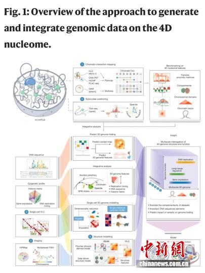 該論文介紹,人類染色體的三維組織結(jié)構(gòu),對于協(xié)調(diào)遺傳物質(zhì)調(diào)控生物反應(yīng)過程起到重要作用。DNA纏繞組蛋白形成名為染色質(zhì)的復(fù)合體,存儲在細(xì)胞核內(nèi)。大量染色質(zhì)位點可通過生物化學(xué)修飾來調(diào)控基因表達(dá)。繪制這一三維結(jié)構(gòu)及其如何經(jīng)時(第四維度)改變的工作,被稱為4D核組學(xué)。