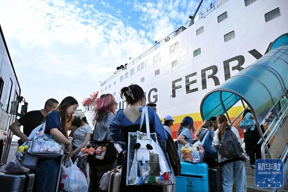 國慶假期,在青島郵輪母港碼頭,旅客登上往返青島港與仁川港的客貨班輪“新金橋5號”。新華社記者 李紫恒 攝