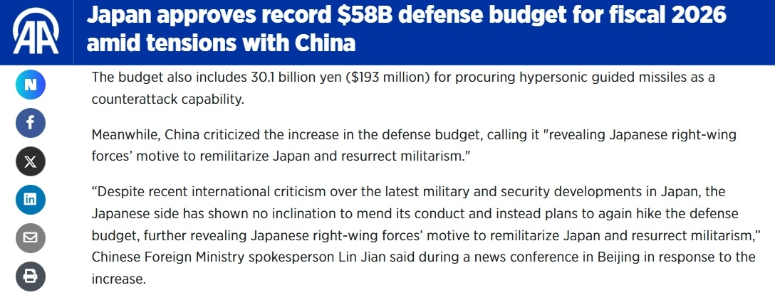 日本政府12月26日批準2026財年(2026年4月至2027年3月)預算案,其中防衛(wèi)預算超9萬億日元,再創(chuàng)歷史新高。其展現(xiàn)出的日本負面軍事動向,受到國際媒體關(guān)注。