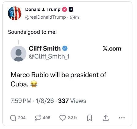 據(jù)報道,特朗普在其社交平臺“真實社交”(Truth Social)上回應了一名用戶早些時候發(fā)布的一則帖文,內(nèi)容寫道“魯比奧將成為古巴總統(tǒng)”。特朗普轉(zhuǎn)發(fā)時附上評論:“我覺得不錯!”