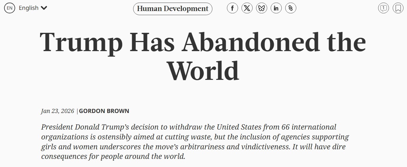 布朗在文章中指出,美國宣布退出的66個(gè)國際組織中包括31個(gè)聯(lián)合國下屬機(jī)構(gòu)和35個(gè)非聯(lián)合國機(jī)構(gòu)。他批評說,從未有任何一國領(lǐng)導(dǎo)人,能在短短一個(gè)月內(nèi)如此全面地切斷本國與國際社會(huì)的聯(lián)系。