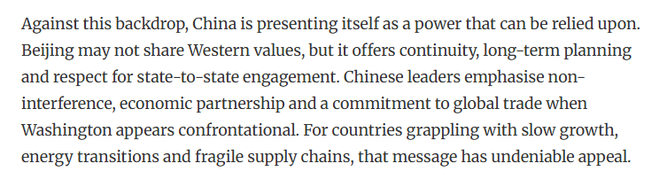 文章認為,在此背景下,中國是可靠力量。中國提供了連續(xù)性、長期規(guī)劃和尊重國家間的交流。中國強調(diào)不干涉、經(jīng)濟伙伴關系和對維護全球貿(mào)易。對于那些正面臨增長緩慢、能源轉型和供應鏈脆弱的國家來說,這一主張具有不可否認的吸引力。另外,中國與美國不同,中國并不要求合作時必須實現(xiàn)意識形態(tài)上的一致性。中國提供市場、投資和交流。在不確定的時代,這些反而更體現(xiàn)了一種穩(wěn)定。