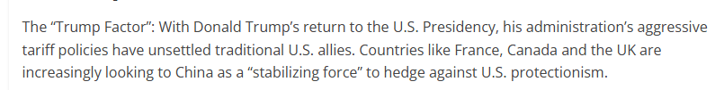 文章說,美國政府的強硬關稅政策令美國傳統(tǒng)盟友感到不安。法國、加拿大和英國等國家正日益將中國視為“穩(wěn)定力量”,以對沖美國保護主義帶來的風險。