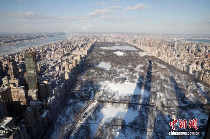 當地時間1月29日,從100層高樓俯瞰冰雪封凍的紐約市,中央公園白雪皚皚,遠處的哈德遜河布滿浮冰。中新社記者 廖攀 攝