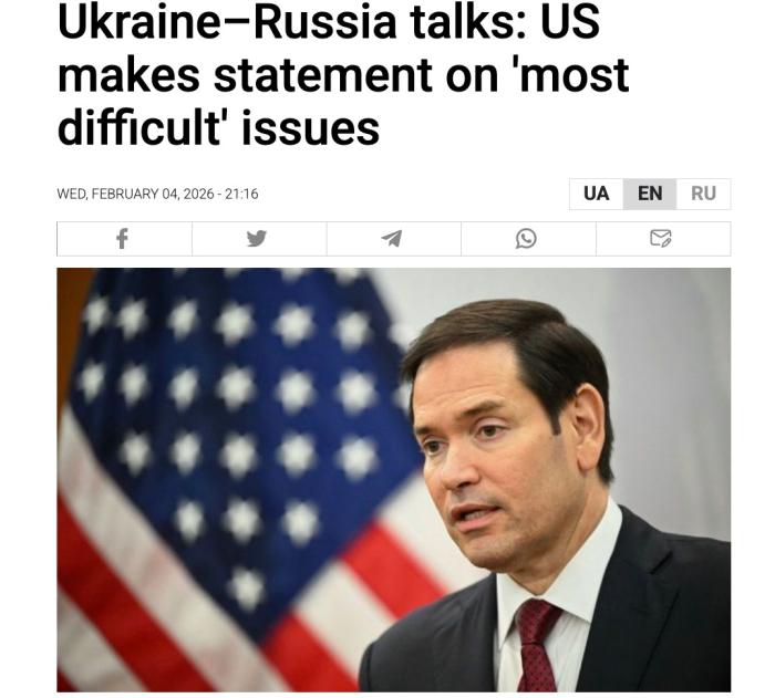 中新網(wǎng)2月5日電 綜合RBC-烏克蘭通訊社等外媒報道,由俄羅斯、美國、烏克蘭三國代表組成的安全問題工作組4日在阿聯(lián)酋首都阿布扎比舉行新一輪會談。美國國務卿魯比奧表示,會談已取得一定進展,但最棘手問題仍未解決。