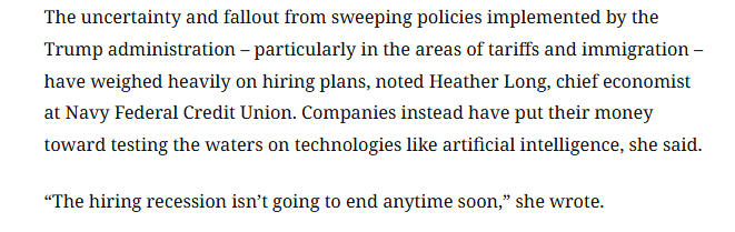 報道還援引美國海軍聯(lián)邦信用合作社(Navy Federal Credit Union)首席經(jīng)濟學家希瑟·朗的觀點稱,特朗普政府推行的一系列政策,尤其是關(guān)稅和移民政策,所帶來的不確定性及后果對招聘計劃造成了沉重影響。希瑟·朗認為,招聘市場的低迷狀況短期內(nèi)不會結(jié)束。