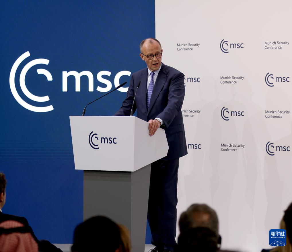 2月13日,在德國慕尼黑,德國總理默茨在第62屆慕尼黑安全會議(慕安會)開幕式上致辭。新華社記者 李穎 攝