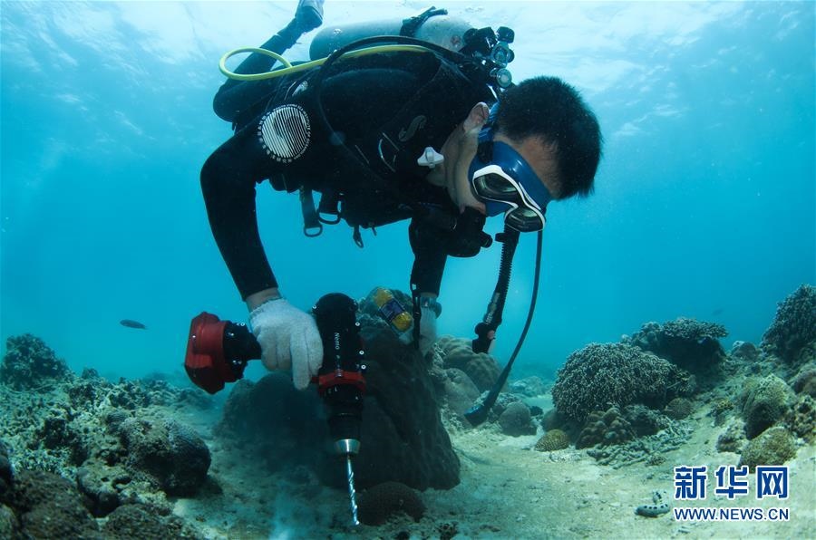 在海南三亞蜈支洲島海域,張浴陽在海底鉆孔,以便安裝移植釘固定珊瑚(4月28日攝)。新華社記者楊冠宇攝