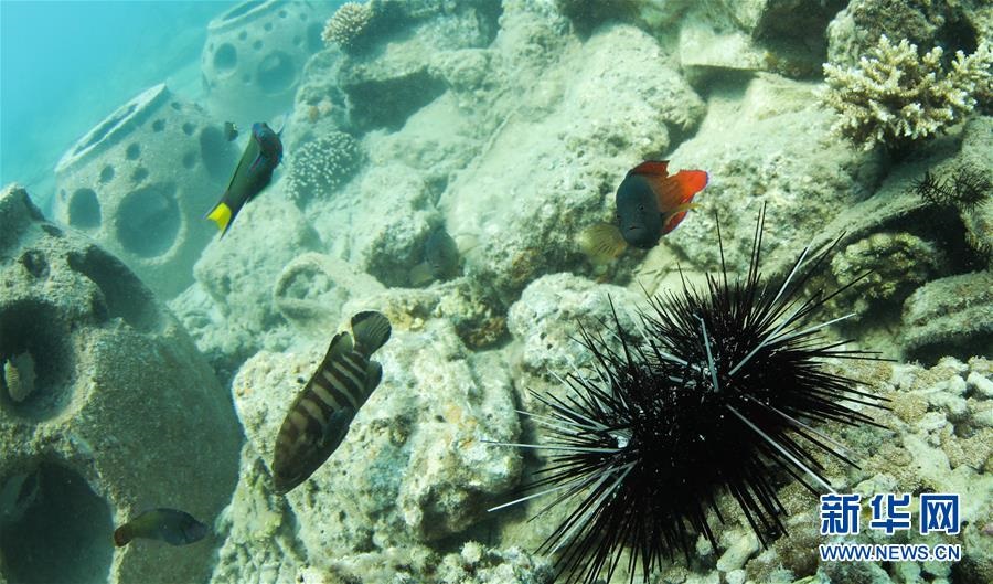 在海南三亞蜈支洲島海域拍攝的與??采男〕篝~(5月28日攝)。海南省三亞蜈支洲島海域海洋牧場是海南首個國家級海洋牧場示范區(qū),也是中國第一個位于熱帶地區(qū)的海洋牧場。近年來,蜈支洲島海域海洋牧場推進海洋生態(tài)系統(tǒng)的恢復(fù)和保護,先后開展了人工魚礁投放、海洋環(huán)境修復(fù)、珊瑚移植等工作。截至2019年底,蜈支洲島海域海洋牧場共投放各類人工魚礁1526塊、船礁21艘和一批火山石礁,共達4萬空立方米,礁區(qū)海域的漁業(yè)資源比非礁區(qū)要高5倍以上。目前,蜈支洲島海域海洋牧場已初現(xiàn)雛形。新華社記者楊冠宇攝