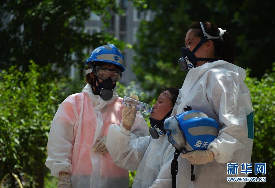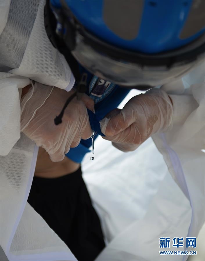 6月16日,北京藍(lán)天救援隊(duì)完成消殺任務(wù)后,一位隊(duì)員的衣服被擰出了汗水。連日來(lái),北京出現(xiàn)高溫天氣??崾钪校ぷ魅藛T堅(jiān)守抗擊疫情一線(xiàn),成為烈日下的“逆行者”。新華社發(fā)(陳鐘昊攝)