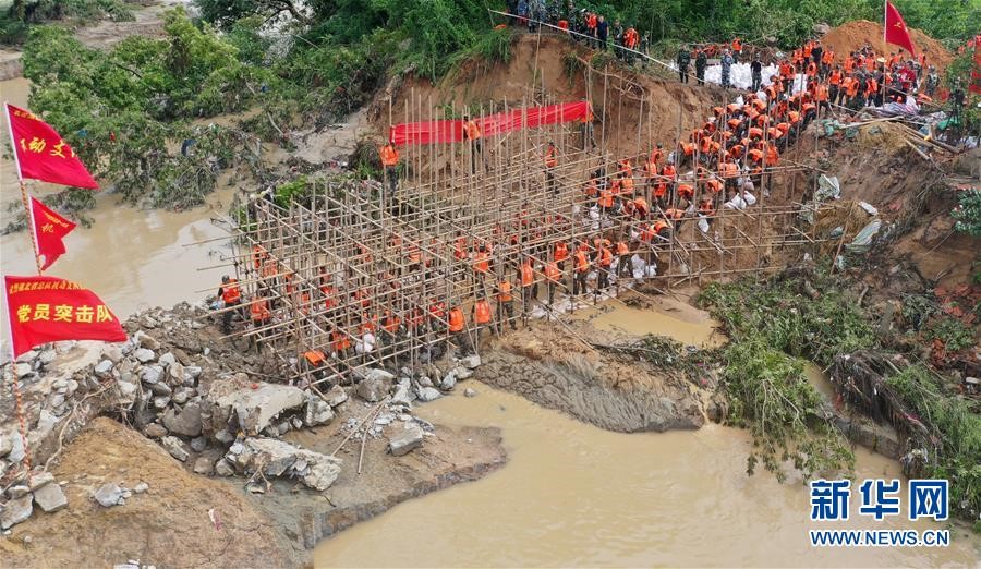 強降雨致使湖北黃梅縣考田河蔡垸村段河堤出現一處200米長的決口,空降兵某旅1000余名官兵奔赴決口河段封堵。整整一個晝夜,大堤上燈火通明,官兵們筑起一道長200米、高5米的防洪堤,成功填堵決口。