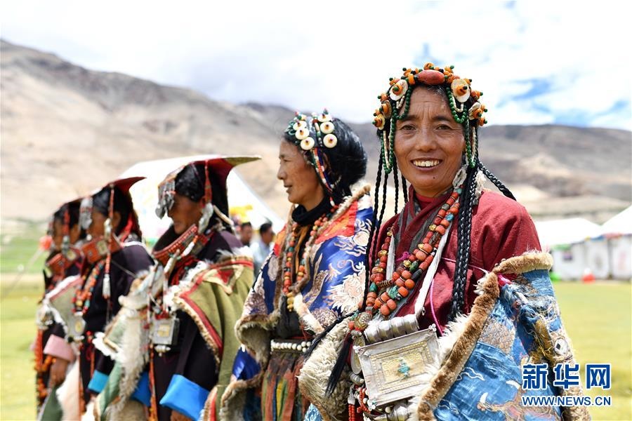 這是7月28日拍攝的身著普蘭服飾的普蘭縣科迦村村民。在西藏阿里地區(qū)普蘭縣,至今保留著獨特的藏族服飾——普蘭服飾。據(jù)了解,普蘭服飾已有1000多年的歷史,其中最精美、最獨特的是婦女的“孔雀”服飾,一套重達20多公斤,裝飾有黃金、白銀、蜜蠟、珊瑚、綠松石等,堪稱“穿在身上的千年歷史”。新華社記者詹彥攝