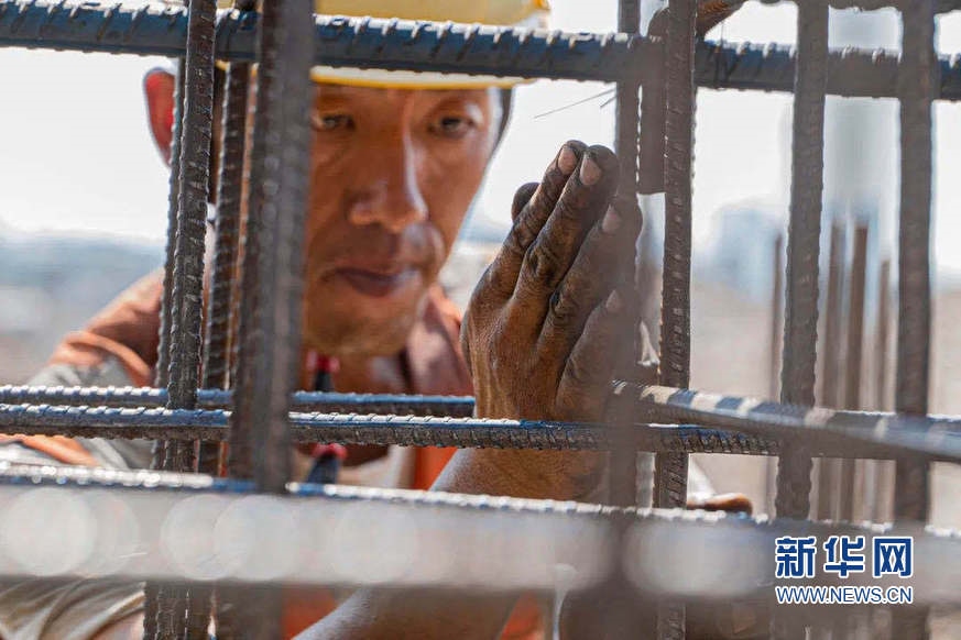 天津港航建設(shè)工人冒著酷暑在天津港c段碼頭建設(shè)現(xiàn)場(chǎng)檢查鋼筋情況。新華網(wǎng)發(fā)