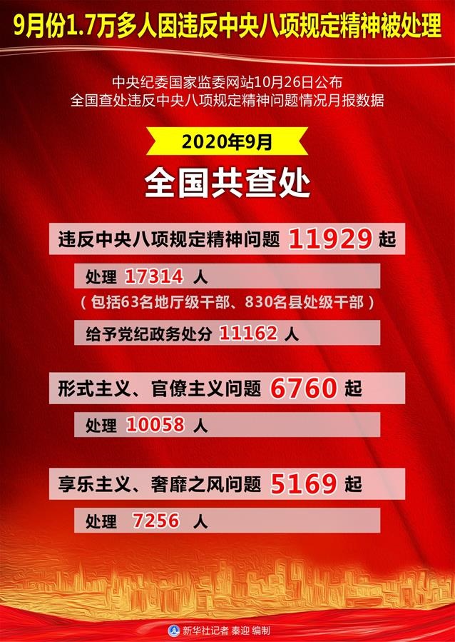 新華社北京10月26日電(記者朱基釵、孫少龍)中央紀(jì)委國家監(jiān)委網(wǎng)站26日公布全國查處違反中央八項(xiàng)規(guī)定精神問題情況月報數(shù)據(jù)。通報顯示,2020年9月,全國共查處違反中央八項(xiàng)規(guī)定精神問題11929起,處理17314人(包括63名地廳級干部、830名縣處級干部),給予黨紀(jì)政務(wù)處分11162人。