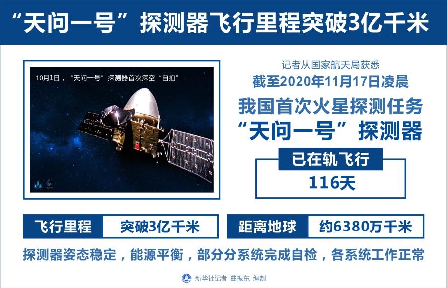 新華社北京11月17日電(記者胡喆)記者從國家航天局獲悉,截至2020年11月17日凌晨,我國首次火星探測任務“天問一號”探測器已在軌飛行116天,飛行里程突破3億千米,距離地球約6380萬千米。探測器姿態(tài)穩(wěn)定,能源平衡,部分分系統(tǒng)完成自檢,各系統(tǒng)工作正常。