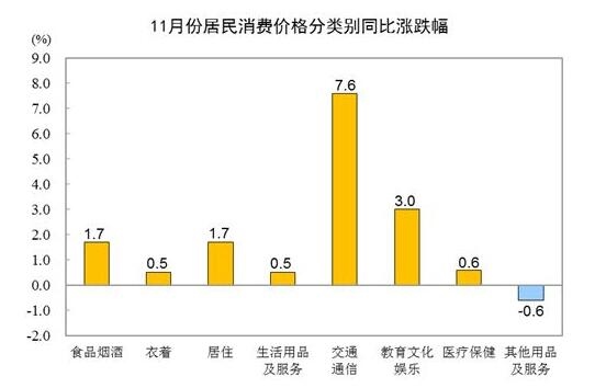 其他七大類價格同比六漲一降。其中,交通通信、教育文化娛樂、居住價格分別上漲7.6%、3.0%和1.7%,醫(yī)療保健、衣著、生活用品及服務價格分別上漲0.6%、0.5%和0.5%;其他用品及服務價格下降0.6%。