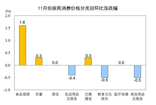 11月份,全國居民消費價格環(huán)比上漲0.4%。其中,城市上漲0.3%,農(nóng)村上漲0.6%;食品價格上漲2.4%,非食品價格持平;消費品價格上漲0.9%,服務價格下降0.3%。