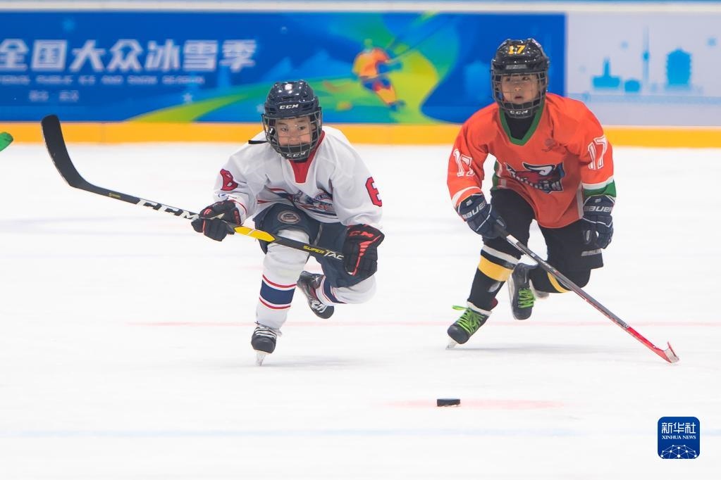 2021年12月19日,在湖北武漢,小球員在“滑向2022”全國(guó)青少年冰球系列賽(武漢站)的比賽中。新華社記者 肖藝九 攝