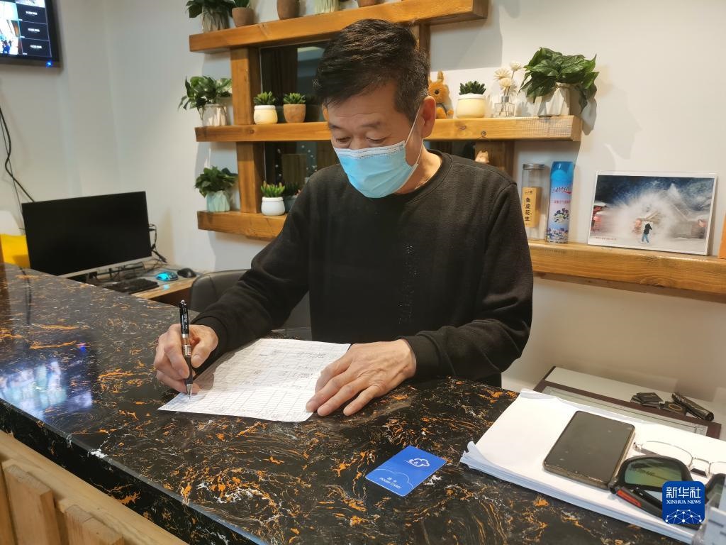 這是2021年1月8日,在黑龍江雪鄉(xiāng),民宿老板樊兆義在柜臺(tái)前核對(duì)住客信息。新華社記者 王君寶 攝