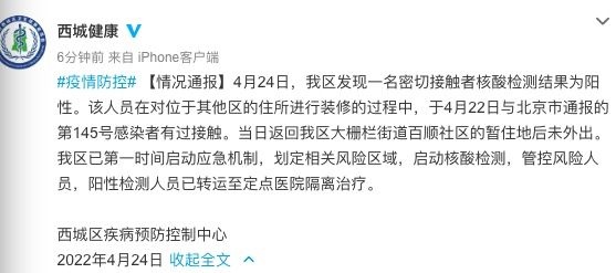 4月24日,我區(qū)(北京市西城區(qū))發(fā)現(xiàn)一名密切接觸者核酸檢測結(jié)果為陽性。該人員在對位于其他區(qū)的住所進(jìn)行裝修的過程中,于4月22日與北京市通報的第145號感染者有過接觸。當(dāng)日返回我區(qū)大柵欄街道百順社區(qū)的暫住地后未外出。