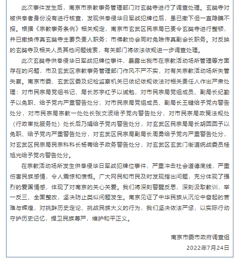 此次玄奘寺供奉侵華日軍戰(zhàn)犯牌位事件,暴露出我市在宗教活動場所管理等方面存在的問題,市及玄武區(qū)宗教事務(wù)管理部門作風(fēng)不嚴(yán)不實(shí),對有關(guān)宗教活動場所失管失察。南京市委、玄武區(qū)委及紀(jì)檢監(jiān)察機(jī)關(guān)已依紀(jì)依規(guī)依法對相關(guān)責(zé)任人作出嚴(yán)肅處理:對市民宗局黨組書記、局長蘇宇紅予以誡勉,對市民宗局黨組成員、副局長紀(jì)勤予以免職、給予黨內(nèi)嚴(yán)重警告處分,對市民宗局黨組成員、副局長王鍵給予黨內(nèi)警告處分,對市民宗局宗教一處處長張文波給予黨內(nèi)警告處分,對市民宗局政策法規(guī)處(行政審批服務(wù)處)處長后乃娟給予黨內(nèi)警告處分,對玄武區(qū)民宗局局長胡圓圓予以免職、給予黨內(nèi)嚴(yán)重警告處分,對玄武區(qū)民宗局副局長周勇給予黨內(nèi)嚴(yán)重警告處分,對玄武區(qū)民宗局民宗科科長楊菁給予政務(wù)警告處分,對玄武區(qū)玄武門街道統(tǒng)戰(zhàn)委員桂旭光給予黨內(nèi)警告處分。