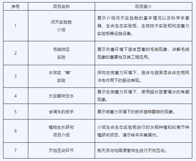 本次太空授課活動將繼續(xù)采取天地互動方式進行,3名航天員將在軌介紹展示中國空間站問天實驗艙工作生活場景,演示微重力環(huán)境下毛細(xì)效應(yīng)實驗、水球變“懶”實驗、太空趣味飲水、會調(diào)頭的扳手以及植物生長研究項目介紹,并與地面課堂進行互動交流(授課內(nèi)容介紹附后),旨在傳播普及載人航天知識,激發(fā)廣大青少年對科學(xué)的興趣。