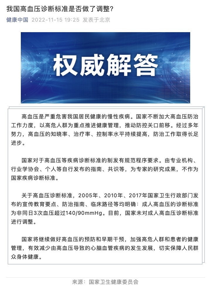 關(guān)于高血壓診斷標(biāo)準(zhǔn),2005年、2010年、2017年國家衛(wèi)生行政部門發(fā)布的宣傳教育要點(diǎn)、防治指南、臨床路徑等均明確:成人高血壓的診斷標(biāo)準(zhǔn)為非同日3次血壓超過140/90mmHg。目前,國家未對(duì)成人高血壓診斷標(biāo)準(zhǔn)進(jìn)行調(diào)整。