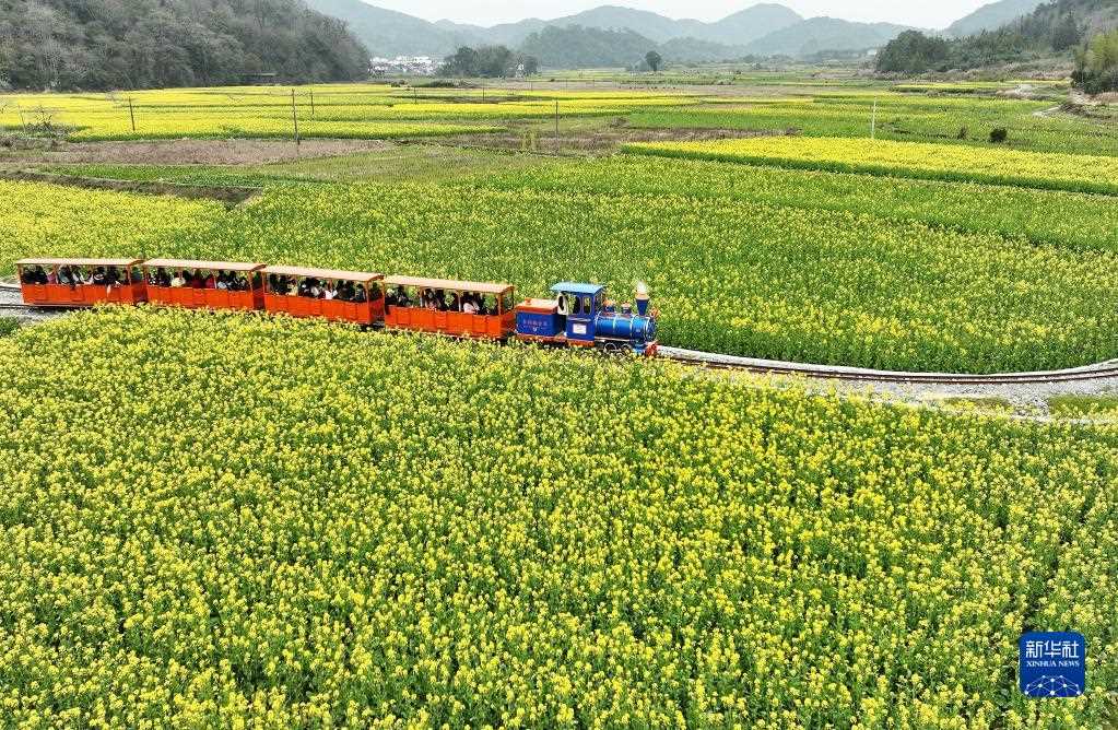 游客在江西省婺源縣嚴(yán)田景區(qū)乘坐“小火車”觀賞花海(3月3日攝,無人機照片)。