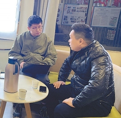 海南分社記者曹文軒(右)在海南省??趶?fù)興城互聯(lián)網(wǎng)信息產(chǎn)業(yè)園黨群服務(wù)中心采訪。張余雪攝