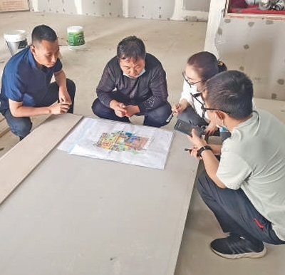 劉振興(左一)在策勒縣天津工業(yè)園區(qū)津和數(shù)字電子展館施工現(xiàn)場辦公。天津援疆前方指揮部供圖