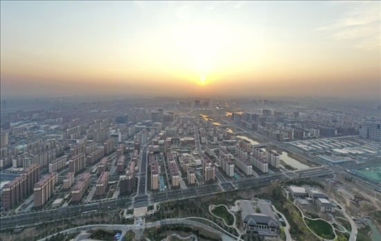 3月31日在雄安新區(qū)拍攝的日出(無人機(jī)照片)。