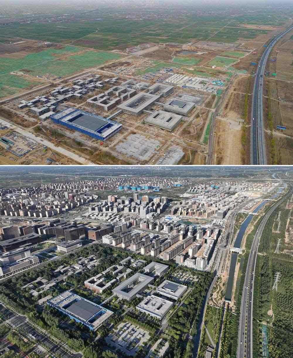 拼版照片:上圖為建設(shè)中的雄安站(無人機(jī)照片,2019年11月7日攝);下圖為建成的雄安站(無人機(jī)照片,2021年4月1日攝)。